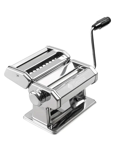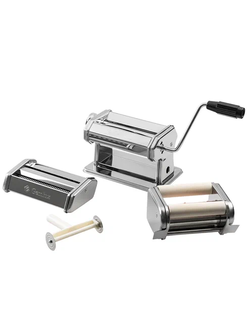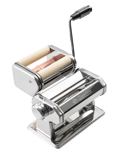Тестораскатка лапшерезка ручная Gemlux GL-PMF-150QJ - это компактная кухонная утварь, предназначенная для раскатки крутого теста в пласт при изготовлении пасты: лазаньи, канеллони, равиоли, домашней лапши различной ширины, лапши для лагмана и т.п. Лучше всего использовать машинку для раскатки яичного теста: на 200 г муки нужно взять 2 яйца, 1 столовую ложку растительного масла и 1/2 чайной ложки соли. Машина для раскатки теста оснащена одной парой валков, которые приводятся во вращение вручную при помощи съемной рукоятки. Ширина раскатки - 15 см, толщина пласта теста регулируется в пределах от 0,5 до 3 мм (7 положений). В комплект поставки тестораскатывающей машинки входит съемная двусторонняя насадка-лапшерезка для приготовления тальолини (плоская лапша шириной 2 мм) и феттучине (плоская лапша шириной 6,25 мм) и насадка для равиоли квадратной формы (2 в ряд, размер 45х45 мм). Для крепления к поверхности стола, чтобы зафиксировать машинку лапшерезку в процессе работы, предусмотрена струбцина. Машина для приготовления лапши выполнена из хромированной стали.