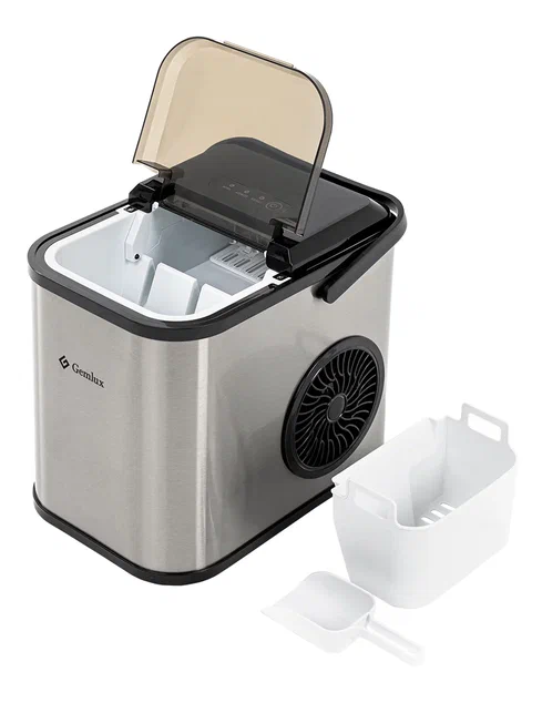 Ледогенератор для дома Gemlux GL-IM99S оснащен резервуаром для воды емкостью 1,2 л и не требует подключения к воде. Генератор льда изготавливает в среднем 8 пальчиков весом 10 г каждые 10 минут. Производительность льдогенератора составляет 10-12 кг льда в сутки. Съемная корзина для льда позволяет создать запас из 800 г (около 80 пальчиков) льда, который сохраняется в течение нескольких часов. Вода, образующаяся при таянии льда, стекает обратно в резервуар. Корпус прибора оснащен удобной откидной крышкой из черной пластмассы со смотровым окном. В комплект поставки входит пластмассовый совок для льда.